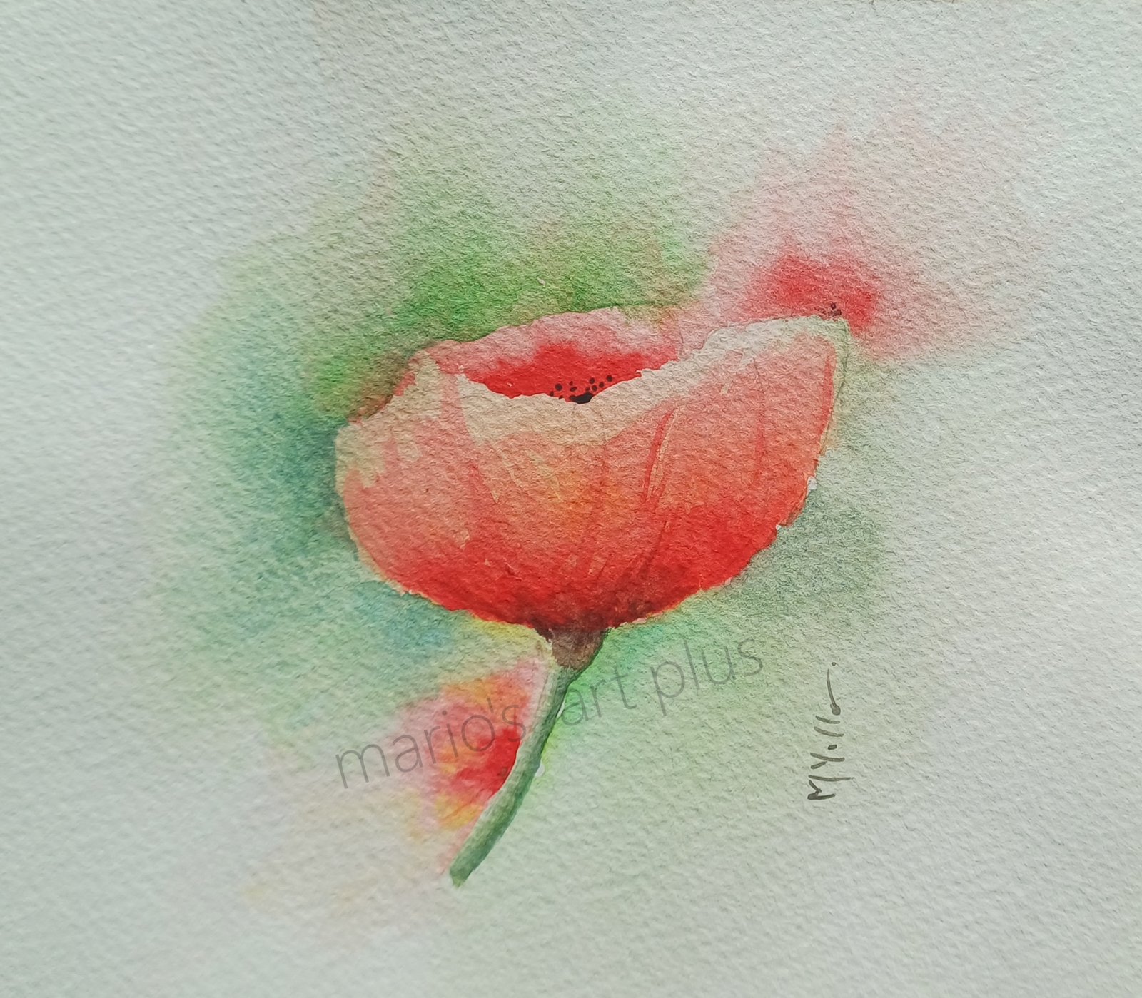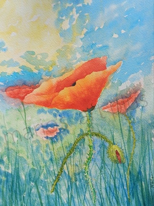 This semi-abstract watercolor painting gracefully captures a vibrant field of poppies in late spring, blending vivid hues with fluid forms to evoke a dreamlike and serene landscape.